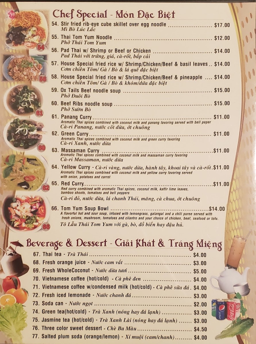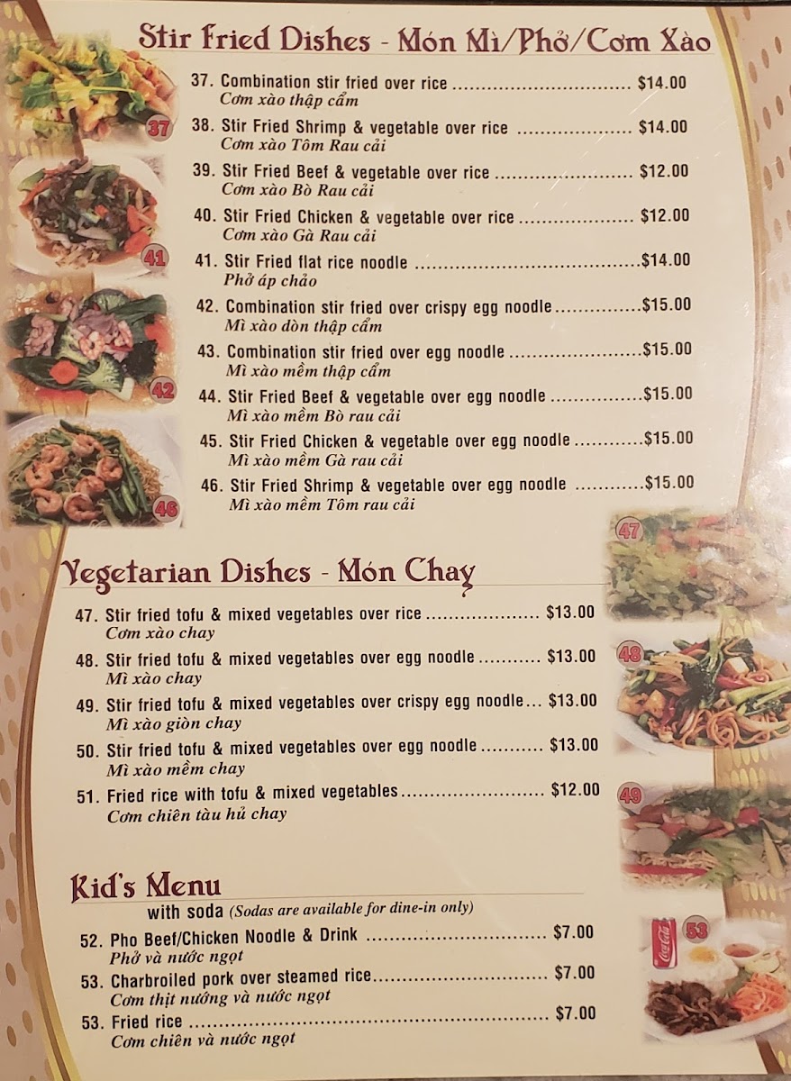 The menu also includes various main courses like Chicken Pho Soup, Stir Fried Rib Eye Steak, Children’s Pho Chicken, Charbroiled Pork & Egg Roll Vermicelli, Seafood Noodle Pho, Beef Stirfry with Vegetables, Combination Seafood Pho, Pork Fried Rice, and Sirloin Steak Cubed with Rice, offering a broad range of protein and noodle-based dishes.