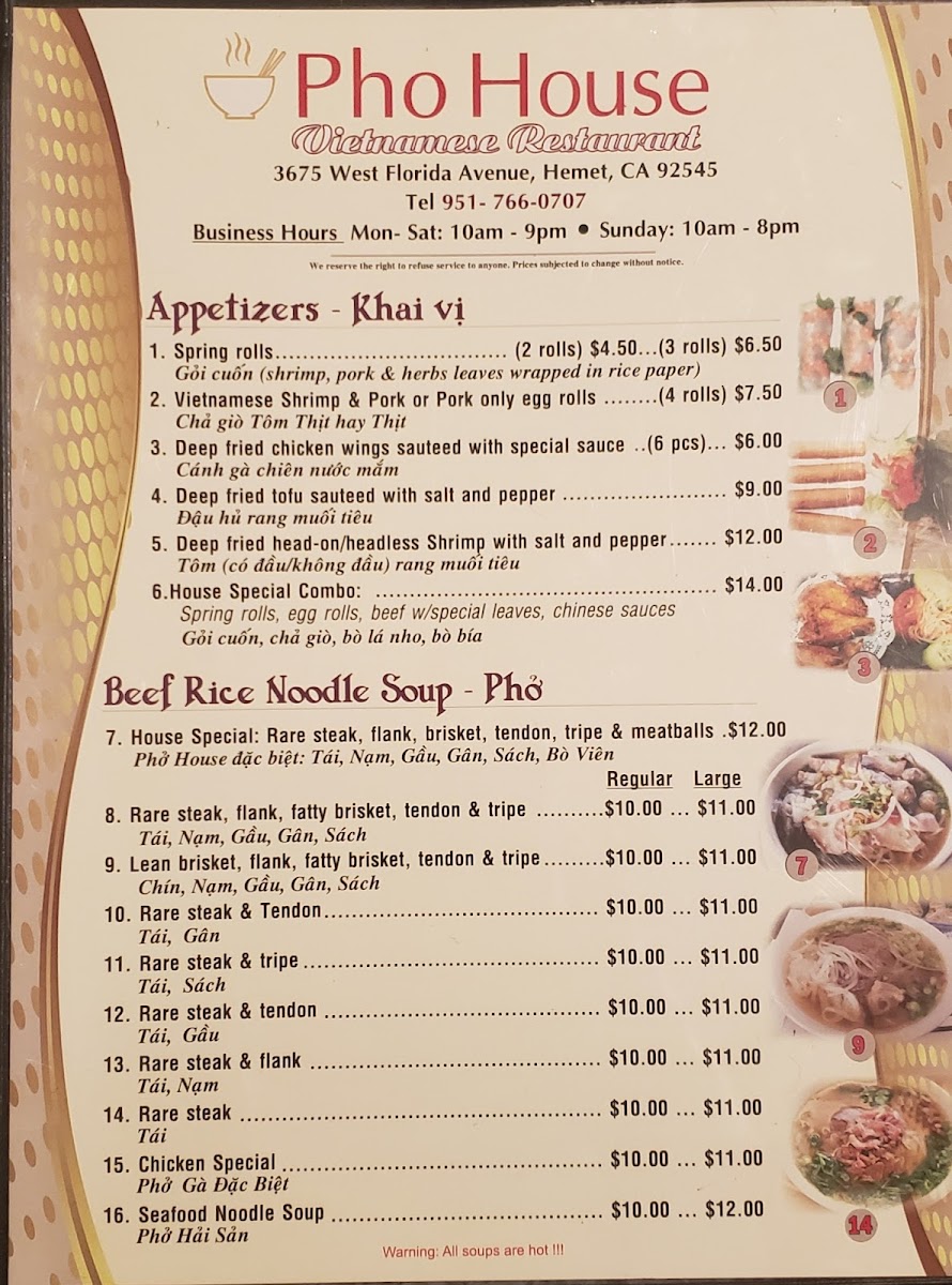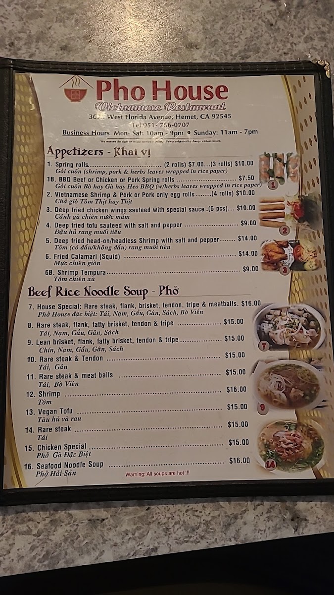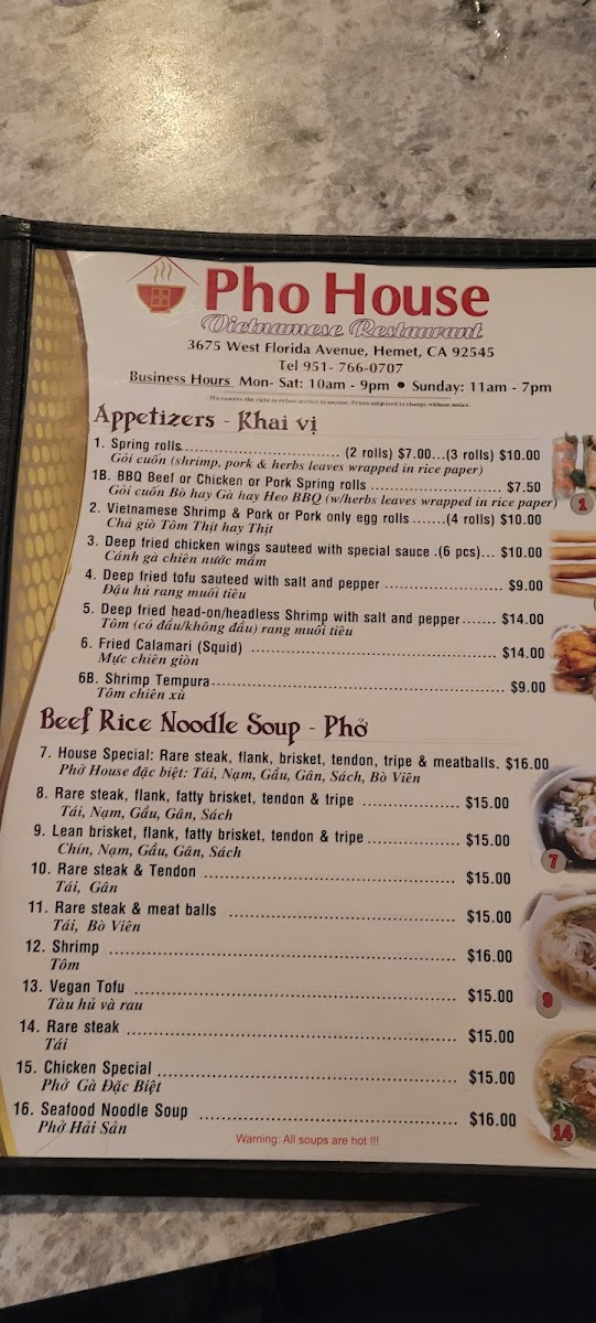 The menu features a variety of Vietnamese dishes centered around traditional pho and other regional specialties. It is organized into several key sections to accommodate different tastes and preferences.