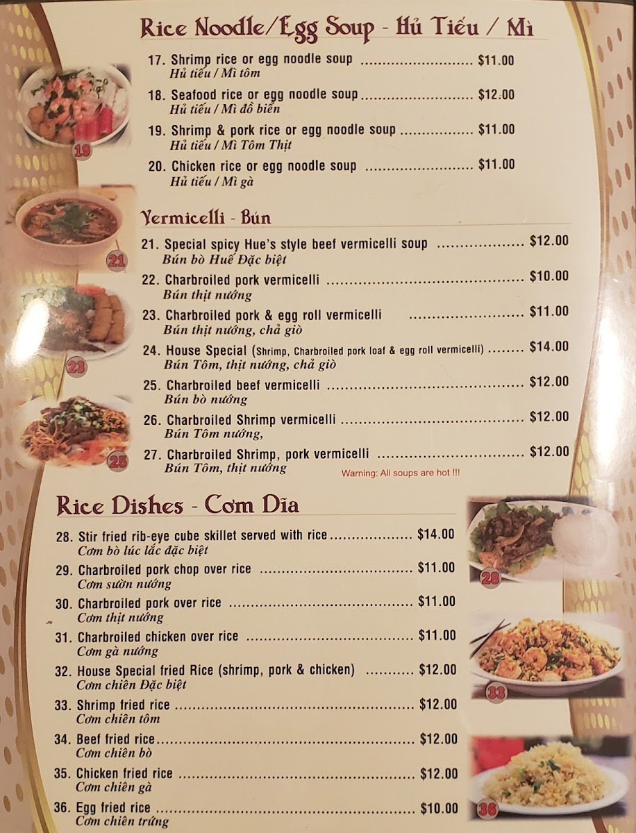 Vermicelli (Bún) dishes offer a selection of grilled meats and seafood served over vermicelli noodles, including Special Spicy Hue’s Style Beef Vermicelli Soup, Charbroiled Pork Vermicelli, Charbroiled Pork & Egg Roll Vermicelli, Charbroiled Beef Vermicelli, Charbroiled Shrimp Vermicelli, and combinations of charbroiled shrimp and pork.